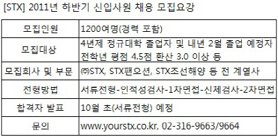 STX는 내달 초까지 그룹 채용 웹사이트(www.yourstx.co.kr)를 통해 대졸 신입사원 원서 접수를 받고, 서류 심사를 통과한 인원을 대상으로 인ㆍ적성검사(SCCT), 직무역량면접(1차 면접), 신체검사, 인성 면접(2차 면접)을 차례로 진행할 예정이다.