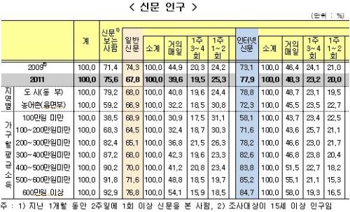 2011년 13세 이상 인구중에서 신문보는 사람의 비율은 75.6%로 지난 2009년 71.4%에 비해 4.2% 증가했고, 가구의 월평균소득이 높을수록 신문을 더 많이 읽는 것으로 나타났다.