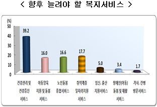 향후 늘려야할 복지서비스로는 '건강관리 및 건강증진 서비스'가 39.2%로 가장 많았고, 특히 60세 이상 노인의 경우 가장 받고 싶은 복지서비스로는 '건강검진'(34.4%)을 꼽았다.