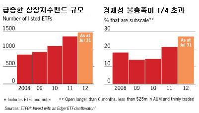 신문의 집계에 따르면 올해 폐지된 ETF 상품은 71개로 지난 2008년 당시 폐지된 상품 규모와 비교해 20% 증가한 것으로 나타났다.