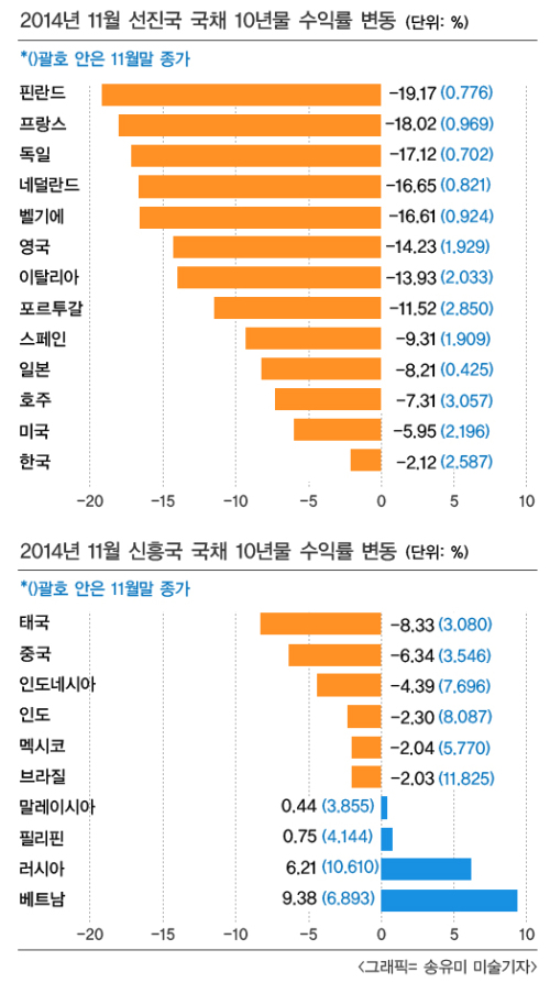 지난 11월 한달간 뉴스핌이 집계한 23개국 채권 가운데 가격이 떨어진 곳(채권수익률 상승)은 신흥국인 러시아와 베트남, 필리핀, 말레이시아 정도였다.