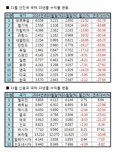 [뉴스핌=노종빈 기자] 지난 11월 글로벌 채권시장은 유럽 선진국 채권이 초강세를 이어갔다. 유럽 주변국 채권은 유럽 선진국 채권에 비해 상대적으로 약세를 나타냈지만 짭짤한 상승세를 지속했다.