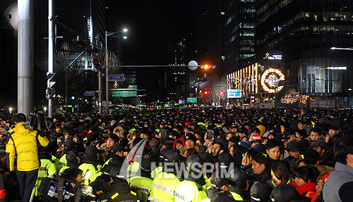 [뉴스핌=이형석 기자] 33번의 제야의 종소리가 울려 퍼진 1일 오전 서울 종로구 보신각에 모인 시민들이 환호성을 지르며 2015년 을미년을 맞이하고 있다.