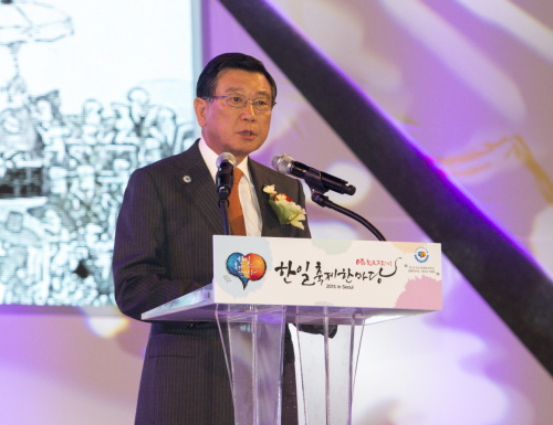 20일 삼성동 코엑스에서 열린 `한일축제한마당 2015 in Seoul` 에서 한국측 실행위원장을 맡은 박삼구 금호아시아나그룹 회장이 인사말을 하는 모습. <사진제공=금호아시아나그룹> |