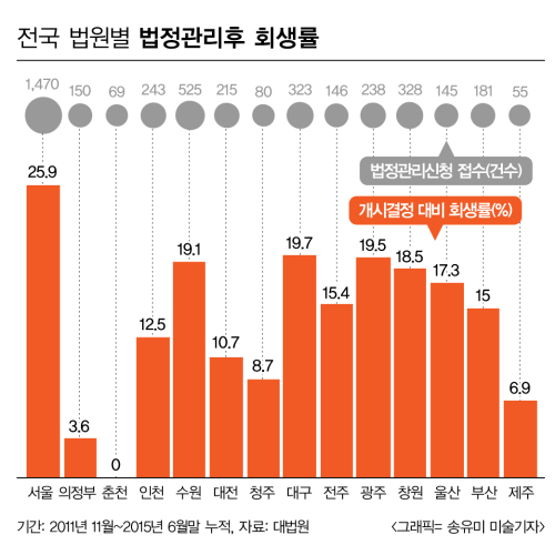 전국 법원별로 회생실적을 보면, 서울지역 법원(서울중앙지방법원)이 부실기업을 가장 잘 살려냈다. 법정관리 개시 결정이 866건으로 가장 많았음에도 회생률도 25.9%로 가장 높았다.