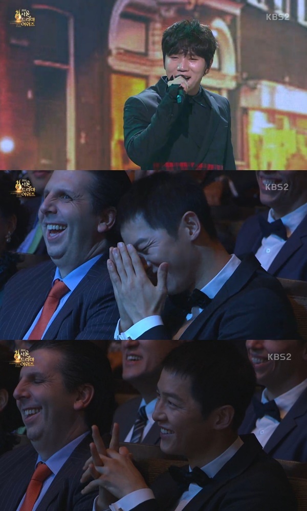 팬들은 환호했고, 그 순간 카메라는 서울드라마어워즈 시상식에 참석한 송중기를 비췄다. 송중기는 예상치 못한 케이윌의 깜짝 애드리브에 당황하면서도 웃음을 참지 못해 눈길을 끌었다.