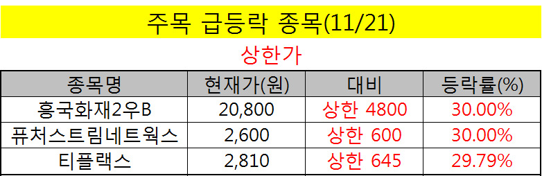 코스피시장에서는 흥국화재2우B가 전 거래일보다 4800원(30%) 오른 2만800원에 거래를 마쳤다.