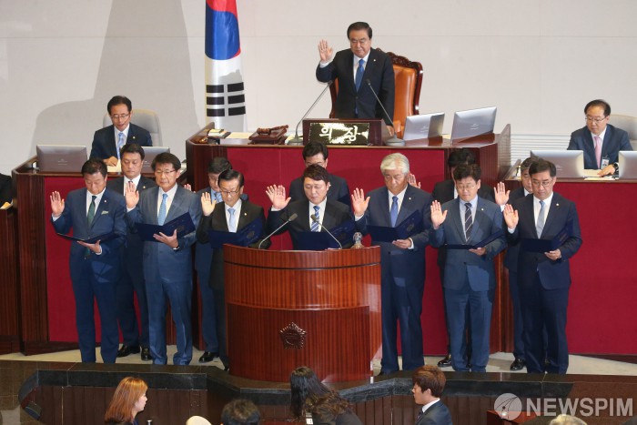[서울=뉴스핌] 최상수 기자 = 문희상 국회의장과 6.13 지방선거 당선 의원들이 13일 오전 서울 여의도 국회에서 열린 본회의에서 의원 선서를 하고 있다. 2018.07.13 kilroy023@newspim.com