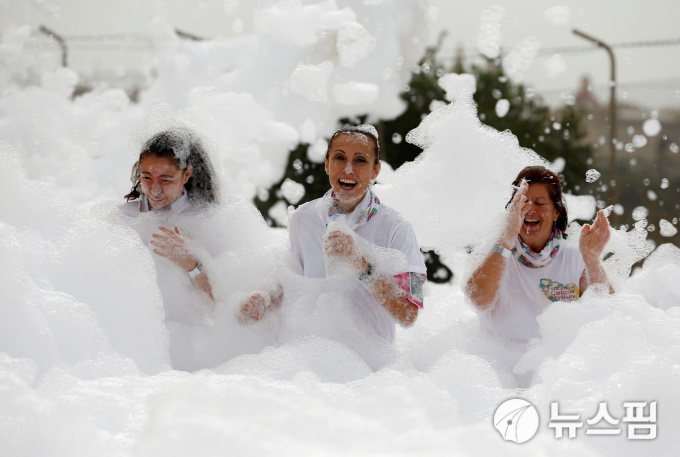 [몰타 로이터=뉴스핌] 최윤정 인턴기자 = 몰타 발레타 마삭셋 항에 있는 마노엘섬에서 '컬러 마이 런(Colour My Run)' 자선행사가 열린 가운데 28일(현지시각) 참가자들이 비누거품을 가르며 달리고 있다.