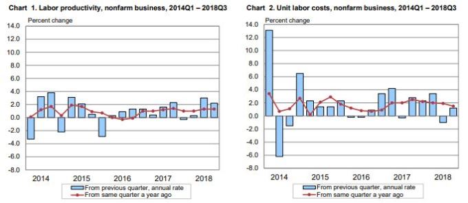 단위당 노동비용은 1.2% 증가해 2014년 3분기 이후 가장 큰 폭인 1.0% 감소한 2분기에서 반등했다. 1년 전과 비교하면 3분기 노동비용은 1.5% 증가했다.노동비용의 증가에도 불구하고 임금은 상승세를 보였다. 시간당 보상은 3분기 중 3.5% 증가해 2분기 1.9%보다 오름폭을 키웠다. 1년 전과 비교하면 시간당 보상은 2.8% 늘었다.