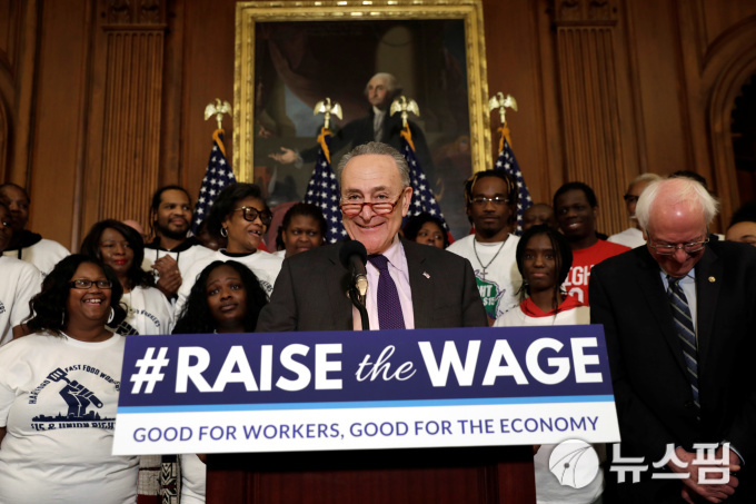 | [워싱턴 로이터=뉴스핌] 이홍규 기자 = 척 슈머 미국 민주당 상원 원내대표가 16일(현지시간) 워싱턴에 위치한 국회의사당에서 열린 '레이즈더웨이지(Raise the Wage Act)' 법안 기자회견 도중 발언하고 있다. 이 법안은 시간당 7.25달러인 연방 시간당 최저임금을 오는 2024년까지 점진적으로 15달러까지 인상하는 내용을 담고 있다. 2018.01.16. |