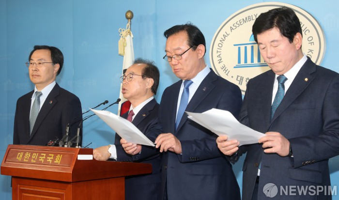 [서울=뉴스핌] 정일구 기자 = 문승욱 경남경제부지사(왼쪽부터), 오거돈 부산시장, 송철호 울산시장, 박재호 더불어민주당 의원이 17일 오후 서울 여의도 국회 정론관에서 부·울·경 단체장 김해신공항 관련 기자회견을 하고 있다. 2019.03.17 mironj19@newspim.com