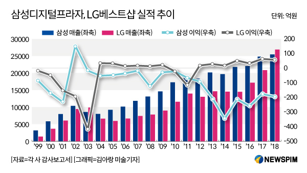 반면 매출과 달리 양사 모두 제대로 된 이익은 내지 못했다. 삼성은 지난해까지 대부분 영업손실을 냈고 LG는 2003년까지 적자였다 이듬해 흑자로 돌아섰지만 0%대의 영업이익률을 벗어나지 못했다.