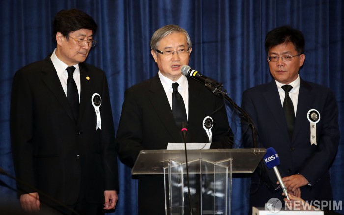 [서울=뉴스핌] 정일구 기자 = 고(故) 이희호 여사 장례위원회 집행위원장을 맡은 김성재 김대중평화센터 상임이사가 11일 오전 서울 서대문구 세브란스병원에서 기자회견을 열고 고인의 유언과 장례 계획에 대해 설명하고 있다. 2019.06.11 mironj19@newspim.com