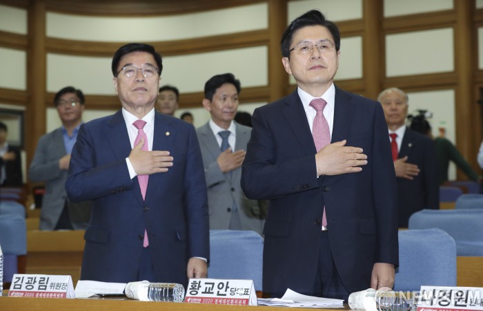 [서울=뉴스핌] 이형석 기자 = 황교안 자유한국당 대표가 18일 오전 서울 여의도 국회 의원회관에서 열린 2020 경제대전환위원회 제1차 전체 토론회에서 국민의례를 하고 있다. 2019.06.18 leehs@newspim.com