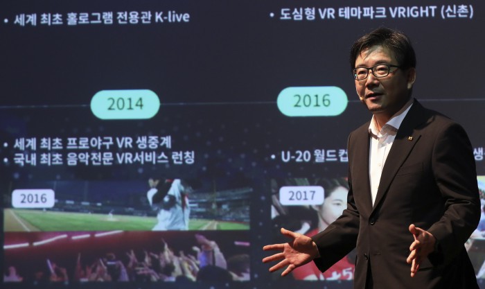 [서울=뉴스핌] 백인혁 기자 = 김훈배 KT뉴미디어사업단 상무가 1일 오전 서울 종로구 광화문 KT스퀘어에서 열린 국내 최초 4K 무선 VR서비스 'KT 슈퍼 VR'출시 기자설명회에서 5G시대 실감미디어 사업전략에 대해 설명하고 있다. 2019.07.01 dlsgur9757@newspim.com