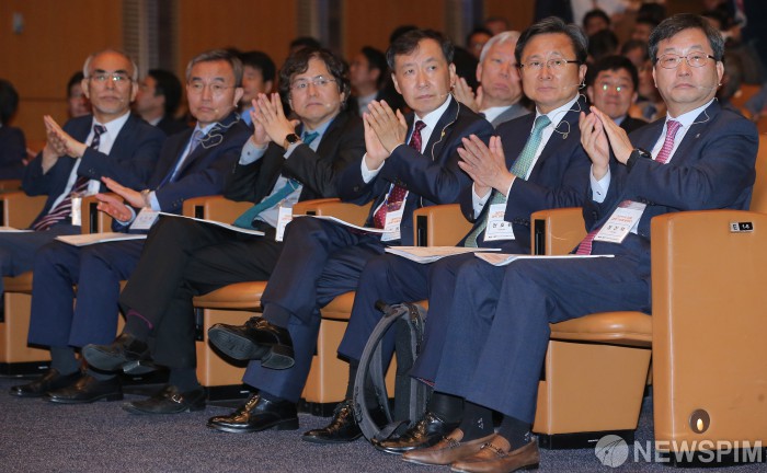 [서울=뉴스핌] 윤창빈 기자 = 정진택 고려대학교 총장(오른쪽부터), 전호환 부산대학교 총장, 신동열 성균관대학교 총장, 박형주 아주대학교 총장, 김우승 한양대학교 총장, 김기선 광주과학기술원 총장이 4일 오전 서울 강남구 코엑스에서 열린 2019 대한민국과학기술연차대회에서 박수를 치고 있다. 2019.07.04 pangbin@newspim.com