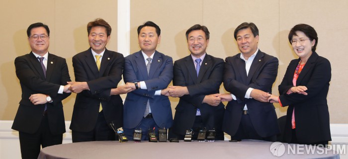 [서울=뉴스핌] 최상수 기자 = 18일 오후 서울 여의도 국회에서 열린 정치협상회의 실무모임에서 참석자들이 기념촬영을 하고 있다. 왼쪽부터 이기우 국회의장비서실 비서실장, 여영국 정의당 의원, 김관영 바른미래당 의원, 윤호중 더불어민주당 의원, 김선동 자유한국당 의원, 박주현 민주평화당 의원. kilroy023@newspim.com