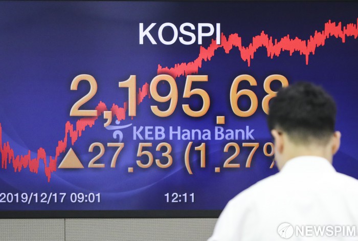 [서울=뉴스핌] 이한결 기자 = 외국민 매수세로 코스피가 1% 이상 급등한 17일 오후 서울 중구 KEB하나은행 딜링룸에서 딜러들이 업무를 보고 있다. 이날 코스피 지수는 전 거래일보다 27.53포인트(1.27%) 오른 2,195.68을 기록했고, 코스닥 지수는 전일 대비 6.14포인트(0.95%) 오른 650.58, 달러/원 환율은 6.1원 내린 1,166.2원에 장을 마쳤다. 2019.12.17 alwaysame@newspim.com
