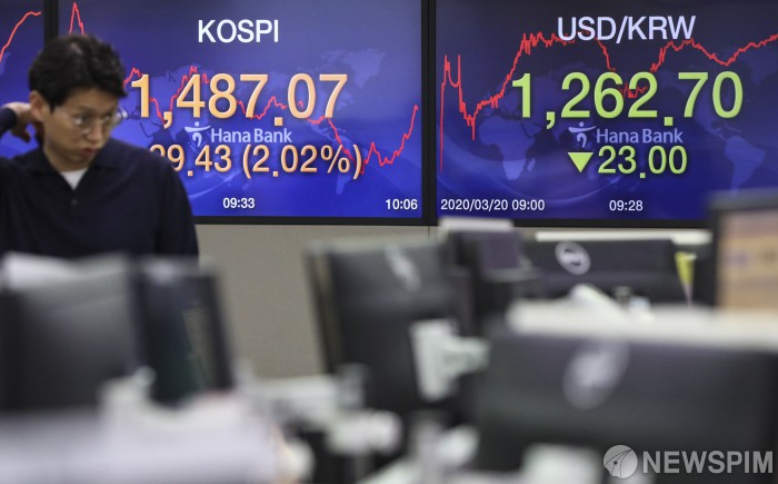 [서울=뉴스핌] 이한결 기자 = 한미 통화스와프가 체결된 20일 오전 달러/원 환율이 전 거래일 대비 32.0원 내린 1253.7원에 출발했다. 코스피 지수는 전 거래일 대비 40.85포인트(2.80%) 오른 1,498.49에 개장했고 코스닥은 15.53포인트(3.63%) 오른 443.88에 시작했다. 이날 오전 서울 중구 하나은행 딜링룸에서 딜러들이 업무를 보고 있다. 2020.03.20 alwaysame@newspim.com