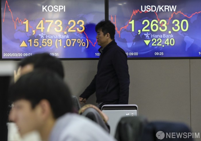 [서울=뉴스핌] 이한결 기자 = 한미 통화스와프가 체결된 20일 오전 달러/원 환율이 전 거래일 대비 32.0원 내린 1253.7원에 출발했다. 코스피 지수는 전 거래일 대비 40.85포인트(2.80%) 오른 1,498.49에 개장했고 코스닥은 15.53포인트(3.63%) 오른 443.88에 시작했다. 이날 오전 서울 중구 하나은행 딜링룸에서 딜러들이 업무를 보고 있다. 2020.03.20 alwaysame@newspim.com