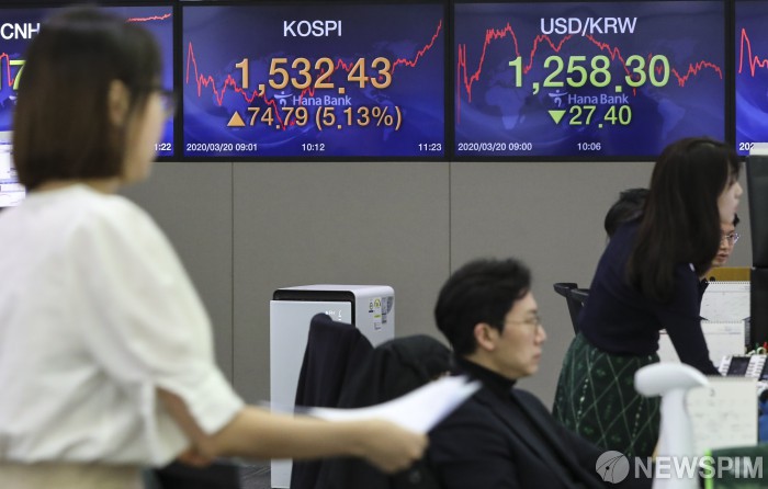 [서울=뉴스핌] 이한결 기자 = 한미 통화스와프가 체결된 20일 오전 코스피 지수가 장중 전 거래일 대비 70포인트 가량 오른 1,530을 넘겼다. 이날 오전 서울 중구 하나은행 딜링룸에서 딜러들이 업무를 보고 있다. 2020.03.20 alwaysame@newspim.com
