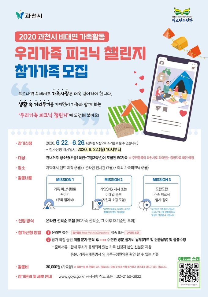 세 번째 미션은 과천시에서 개최하는 피크닉 행사에 참여하는 것이다. 과천시는 오는 8월 중 거리두기 지침을 준수한 가운데 문화예술 공연과 체험활동 등을 포함한 피크닉 행사를 열 예정이며 여기에 가족들이 직접 만든 피크닉텐트를 가지고 참여하면 된다.