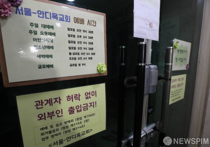 [서울=뉴스핌] 김학선 기자 = 수도권 교회발 신종 코로나바이러스 감염증(코로나19) 집단감염이 확산하고 있는 18일 오후 16명의 누적 확진자가 발생한 서울 노원구 안디옥교회에 집합제한 명령서가 붙어 있다. 2020.08.18 yooksa@newspim.com