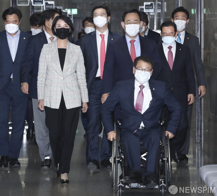 [서울=뉴스핌] 이형석 기자 = 주호영 국민의힘 원내대표와 이영 위원장이 5일 오후 서울 여의도 국회에서 열린 '국민의힘 정부정책 감시특별위원회' 임명장 수여식 및 1차 회의에 입장하고 있다. 2020.10.05 leehs@newspim.com