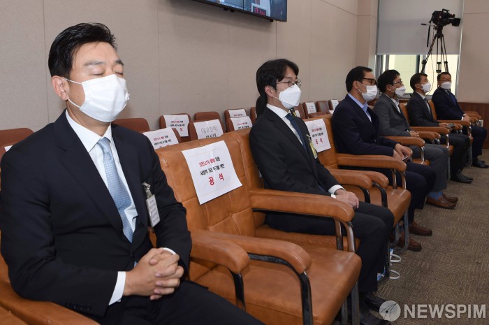 [서울=뉴스핌] 최상수 기자 = 국정감사 이틀째인 8일 강신봉 딜리버리히어로코리아 대표(왼쪽부터), 김범준 우아한형제들 대표, 김성민 한국마트협회장, 이종민 삼성전자 상무, 김동욱 현대자동차 전무 등 기업인들이 산업통상자원중소벤처기업위원회 국정감사에 앞서 개회를 기다리고 있다. 2020.10.08 kilroy023@newspim.com