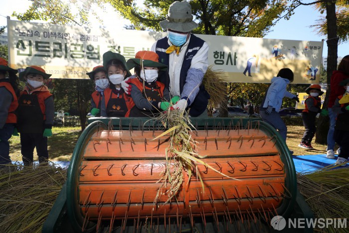 [서울=뉴스핌] 정일구 기자 = 23일 오전 서울 양천구 신트리공원에서 어린이들이 전통 벼 베기 및 탈곡 체험을 하고 있다. 2020.10.23 mironj19@newspim.com