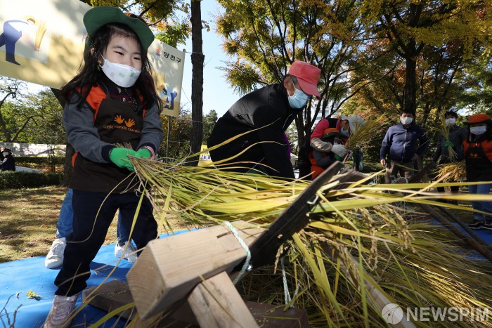 [서울=뉴스핌] 정일구 기자 = 23일 오전 서울 양천구 신트리공원에서 어린이들이 전통 벼 베기 및 탈곡 체험을 하고 있다. 2020.10.23 mironj19@newspim.com