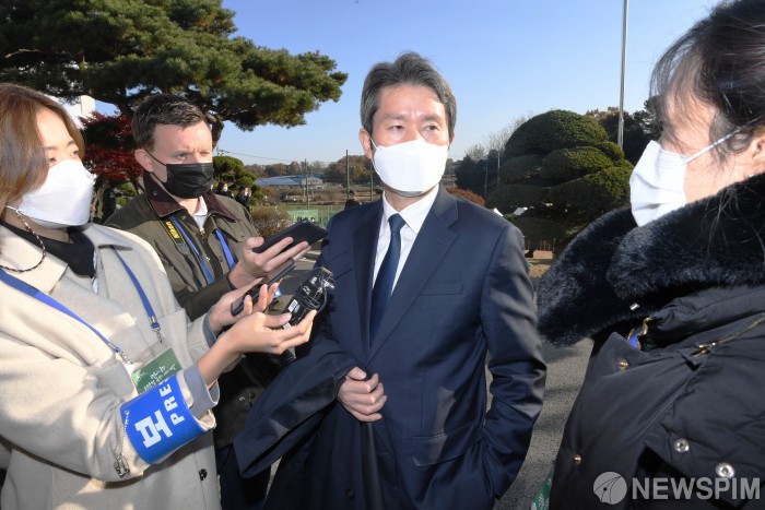 [판문점=뉴스핌] 사진공동취재단 = 4일 오전 파주시 군내면 판문점견학센터개소식에 참석하는 이인영 통일부 장관이 취재진의 질문에 답하고 있다. 2020.11.04 photo@newspim.com