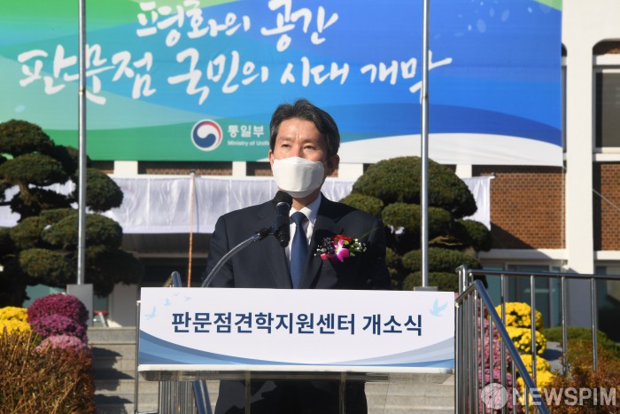 [판문점=뉴스핌] 사진공동취재단 = 이인영 통일부 장관이 4일 오전 경기도 파주시 판문점견학지원센터에서 열린 개소식에서 기념사를 하고 있다. 2020.11.04 photo@newspim.com