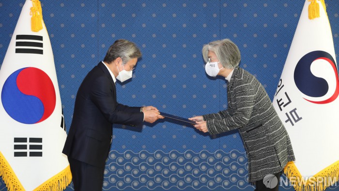 [서울=뉴스핌] 김학선 기자 = 강경화 외교부 장관이 3일 서울 종로구 외교부 청사에서 손혁상 한국국제협력단(KOICA) 신임 이사장에게 임명장을 수여하고 있다. 2020.12.03 yooksa@newspim.com