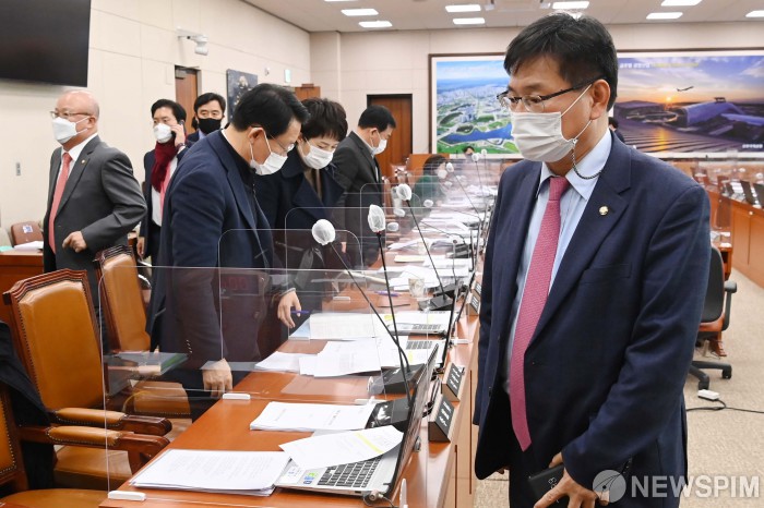 [서울=뉴스핌] 최상수 기자 = 24일 국회에서 열린 국토교통위원회 전체회의에서 국민의힘 간사 이헌승(오른쪽) 의원 등 야당 의원들이 회의실을 퇴장하고 있다. 2020.12.24 kilroy023@newspim.com