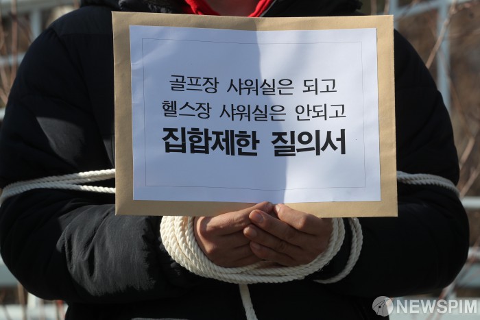 [서울=뉴스핌] 김학선 기자 = 대한피트니스경영자협회 등 실내체육시설 종사자들이 27일 서울 종로구 정부서울청사 앞에서 기자회견을 열고 정부의 모호한 방역지침 기준을 규탄하고 있다. 2021.01.27 yooksa@newspim.com