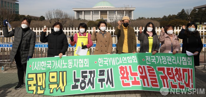 [서울=뉴스핌] 최상수 기자 = 한국YWCA연합회, 한국가사노동자협회, 전국가정관리사협회가 24일 오전 서울 여의도 국회 앞에서 가사노동자법 제정 농성장 기자회견을 열고 있다. 2021.02.24 kilroy023@newspim.com