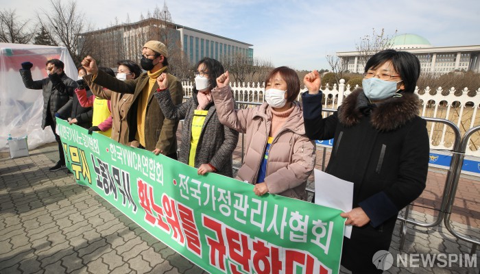 [서울=뉴스핌] 최상수 기자 = 한국YWCA연합회, 한국가사노동자협회, 전국가정관리사협회가 24일 오전 서울 여의도 국회 앞에서 가사노동자법 제정 농성장 기자회견을 열고 있다. 2021.02.24 kilroy023@newspim.com