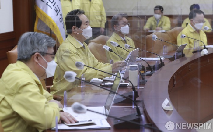 [서울=뉴스핌] 이형석 기자 = 정세균 국무총리가 16일 오전 서울 종로구 정부서울청사에서 열린 코로나19 대응 중대본회의에서 모두발언을 하고 있다. 2021.03.16 leehs@newspim.com