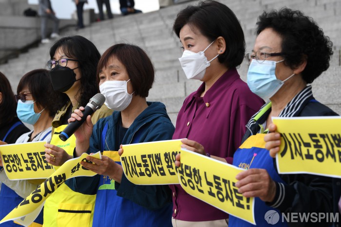 [서울=뉴스핌] 이형석 기자 = 최영미 한국가사노동자협회 대표(왼쪽에서 세 번째)가 21일 오후 서울 여의도 국회에서 '가사노동자 고용개선법 통과, 환영 기자회견'에 참석해 발언하고 있다. 2021.05.21 leehs@newspim.com