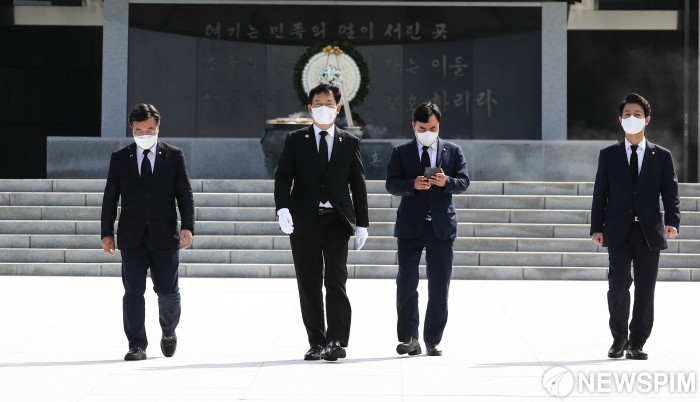 [서울=뉴스핌] 이형석 기자 = 송영길 더불어민주당 대표와 윤호중 원내대표가 김대중 전 대통령 서거 12주기인 18일 서울 동작구 국립서울현충원을 방문해 현충탑 참배를 마친 뒤 돌아나오고 있다. 2021.08.18 leehs@newspim.com