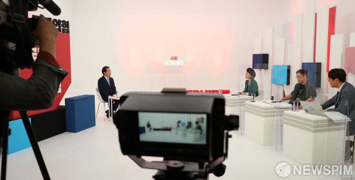 [서울=뉴스핌] 최상수 기자 = 9일 서울 금천구 즐스튜디오에서 열린 국민의힘 대선 경선 후보 국민 시그널 공개면접에 참가한 홍준표 후보(왼쪽)가 답변하고 있다. 심사위원은 김준일 대표, 진중권 전 동양대 교수, 박선영 동국대 교수(오른쪽부터). 2021.09.09 kilroy023@newspim.com