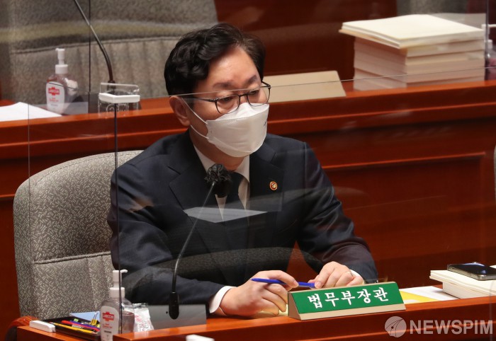 [서울=뉴스핌] 이형석 기자 = 박범계 법무부 장관이 12일 열린 국회 예산결산특별위원회 비경제부처 부별심사에서 의원 질의에 답변하고 있다. 2021.11.12 leehs@newspim.com