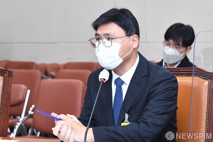 [서울=뉴스핌] 이형석 기자 = 김의철 후보자가 22일 서울 여의도 국회에서 열린 과학기술정보방송통신위원회에서 한국방송공사(KBS) 사장 인사청문회에서 의원들의 질의에 답하고 있다. 2021.11.22 leehs@newspim.com