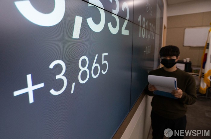 [성남=뉴스핌] 윤창빈 기자 = 28일 오후 경기 성남시 성남시청 재난안전상황실 전광판에 코로나 신규 확진자와 누적 확진자가 표시되고 있다. 이날 0시 기준 코로나19 신규 확진자는 3865명을 기록했다. 3000명대 확진자는 지난달 30일 3032명 이후 28일 만이다. 2021.12.28 pangbin@newspim.com