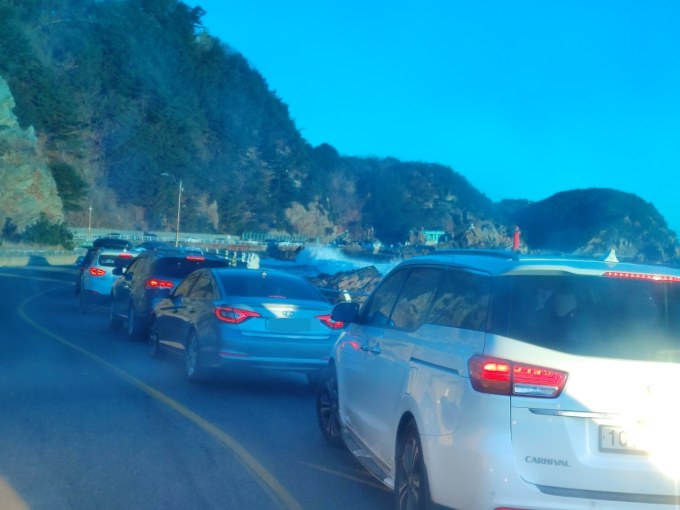 | [강릉=뉴스핌] 이순철 기자 = 강릉 심곡항에서 정동진 사이 헌화로 일대에서 해맞이를 마치고 돌아가는 차량으로 인해 정체되고 있다.2022.01.01 grsoon815@newspim.com |
