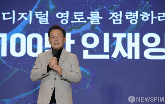 [서울=뉴스핌] 이형석 기자 = 이재명 더불어민주당 대선 후보가 11일 오후 서울 영등포구 여의도 중소기업중앙회관에서 ‘디지털 혁신 정책공약 1호’를 발표하고 있다. 2022.01.11 leehs@newspim.com