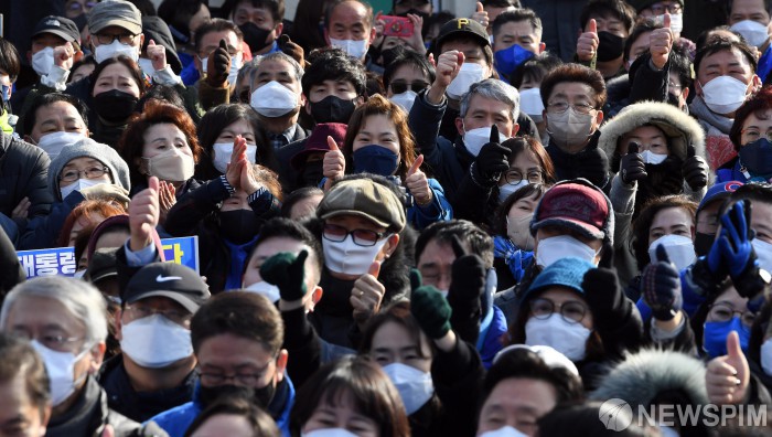 [부산=뉴스핌] 이형석 기자 = 대선 공식선거운동 첫 날인 15일 부산 부전역에서 열린 이재명 더불어민주당 후보 유세현장에서 지지자들이 후보이름을 연호하고 있다. 2022.02.15 leehs@newspim.com