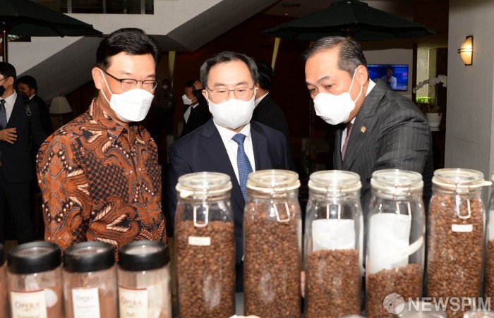 [서울=뉴스핌] 문승욱 산업통상자원부 장관이 21일(현지시간) 인도네시아 자카르타 무역부장관 집무실에서 무하마드 루트피 (Muhammad Lutfi) 무역부 장관과 면담을 갖고 있다. [사진=산업통상자원부] 2022.02.21 photo@newspim.com